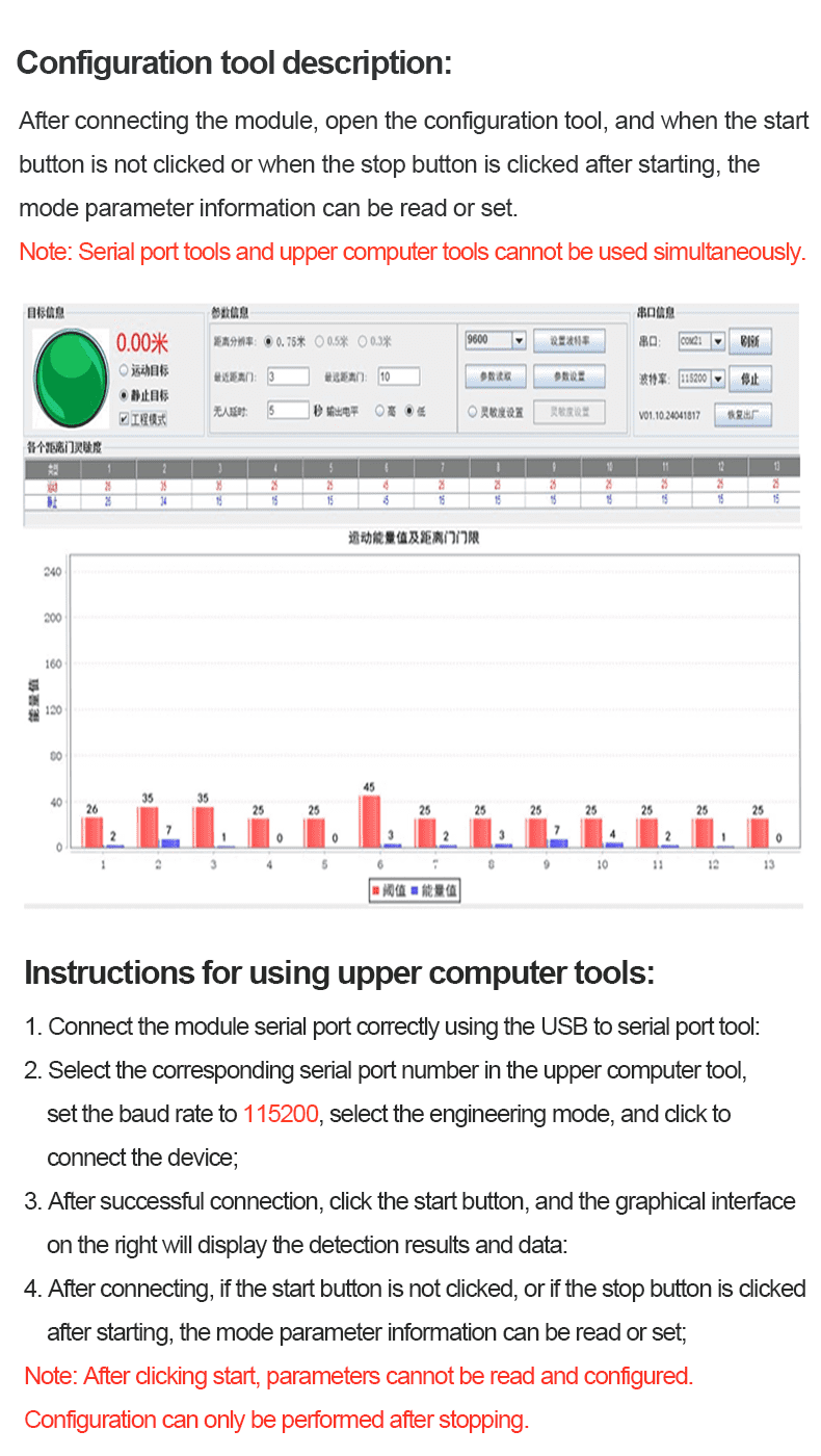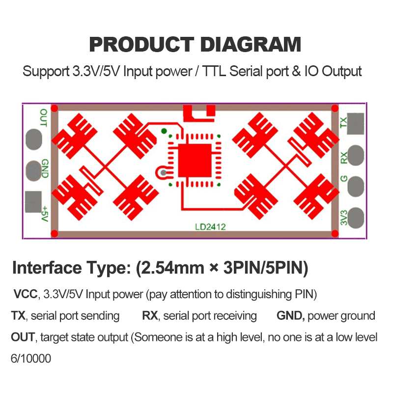 HLK-LD2412 is a highly sensitive 24GHz human presence state sensing module developed by HI-LINK Electronics. Its working principle is to use FMCW frequency modulation continuous wave to detect human targets in the set space, combined with radar signal processing and precise human body sensing algorithms, to achieve high sensitivity human body presence state sensing, recognize human bodies in both moving and stationary states, and calculate auxiliary information such as target distance. This product is mainly used in indoor scenes to perceive whether there is movement or micro movement of the human body in the perception area, and to output real-time detection results. The farthest sensing distance can reach 9 meters, with a distance resolution of 0.75 meters. Provide visual configuration tools that can easily configure sensing distance range, sensing sensitivity in different intervals, and unmanned delay time to meet different specific application requirements.