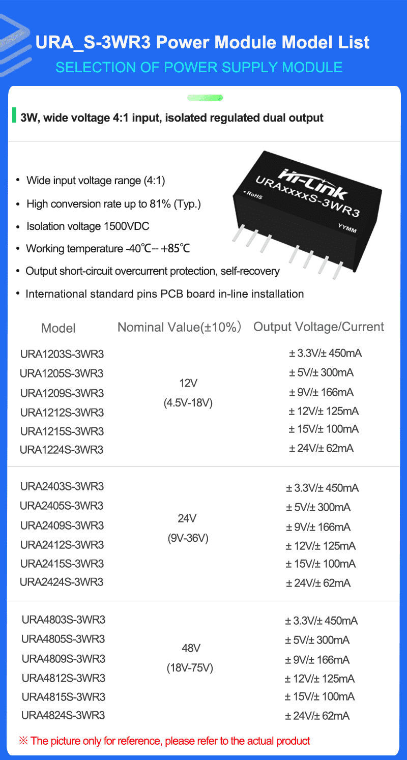 1. Wide input voltage range 4:1, isolated regulated output 3W