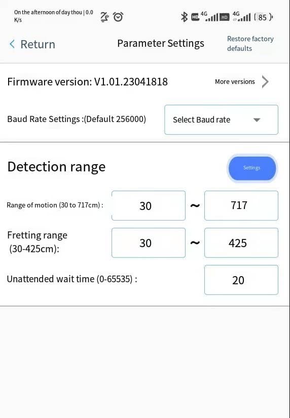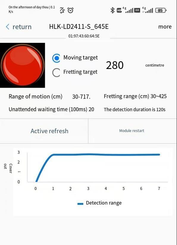 Open the app and search for nearby radar devices. The device's broadcast name is "HLK-LD2411-Sxxxx" (xxxx is the last four MAC addresses). After successfully connecting the module, you can view radar information, or debug and save parameters.