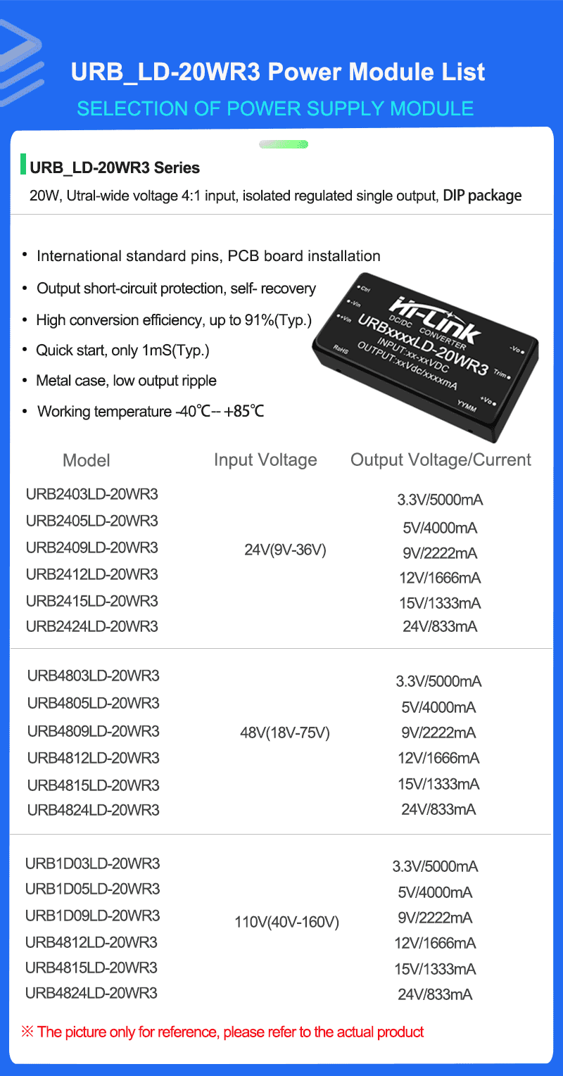 URB1D05LD-20WR3 URB1D12LD/URB1D09LD/URB1D24LD DCDC isolated and regulated power module 110V to 3.3/9/12/15/24V single output