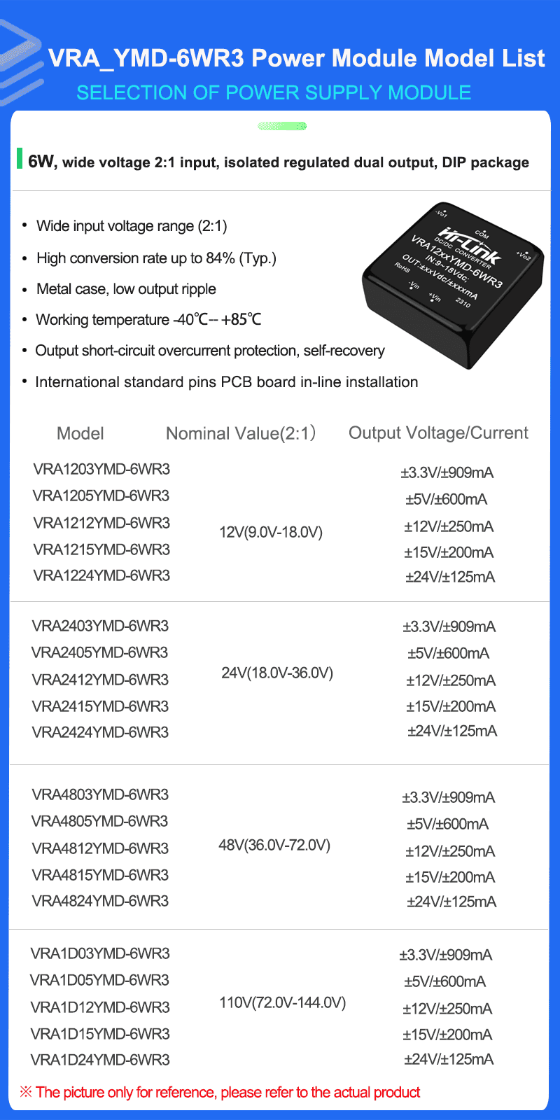 1. Wide input voltage range 2:1, isolated regulated output 6W