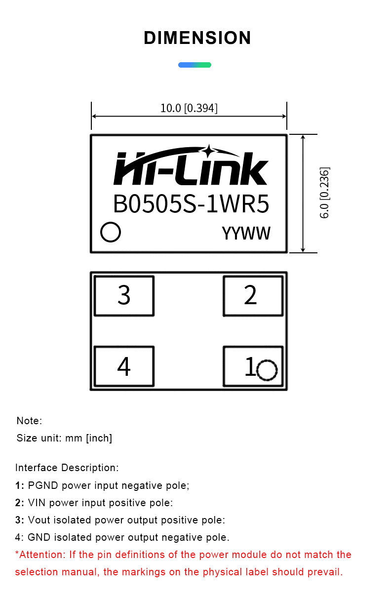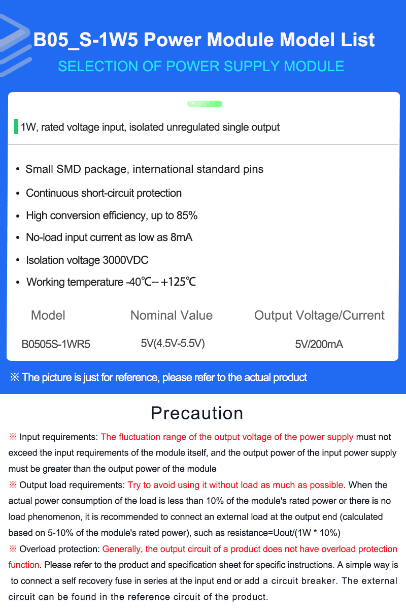 In order to ensure that the module can work efficiently and reliably, the minimum output load should not be less than 10% of the rated load.If the power you need is really small, please connect a resistor in parallel between the positive and negative poles of the output terminal (the sum of the actual power used by the resistor is greater than or equal to 10% of the rated power and the rated power of the selected resistor must be greater than 5 times of the actual power used, otherwise the temperature of the resistor will be higher)